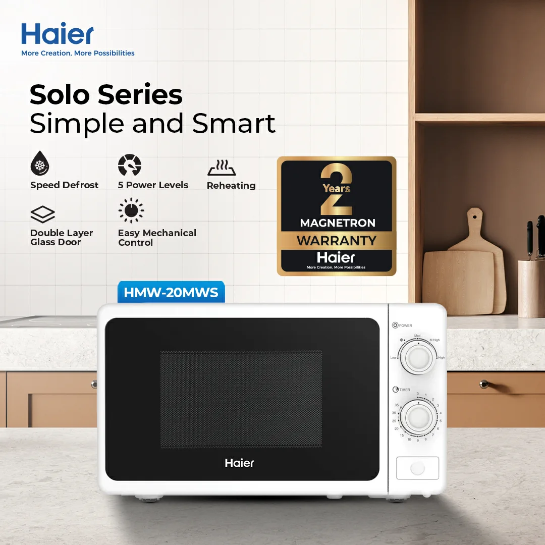 The Haier HMW-20MWS SOLO SERIES Microwave Oven is a compact yet powerful kitchen essential designed for everyday convenience. With a 20-liter capacity and 700 watts of cooking power, it offers reliable performance for reheating, defrosting, and simple cooking tasks. Its mechanical knob controls make it user-friendly, while the sleek design ensures it fits seamlessly into any modern kitchen.