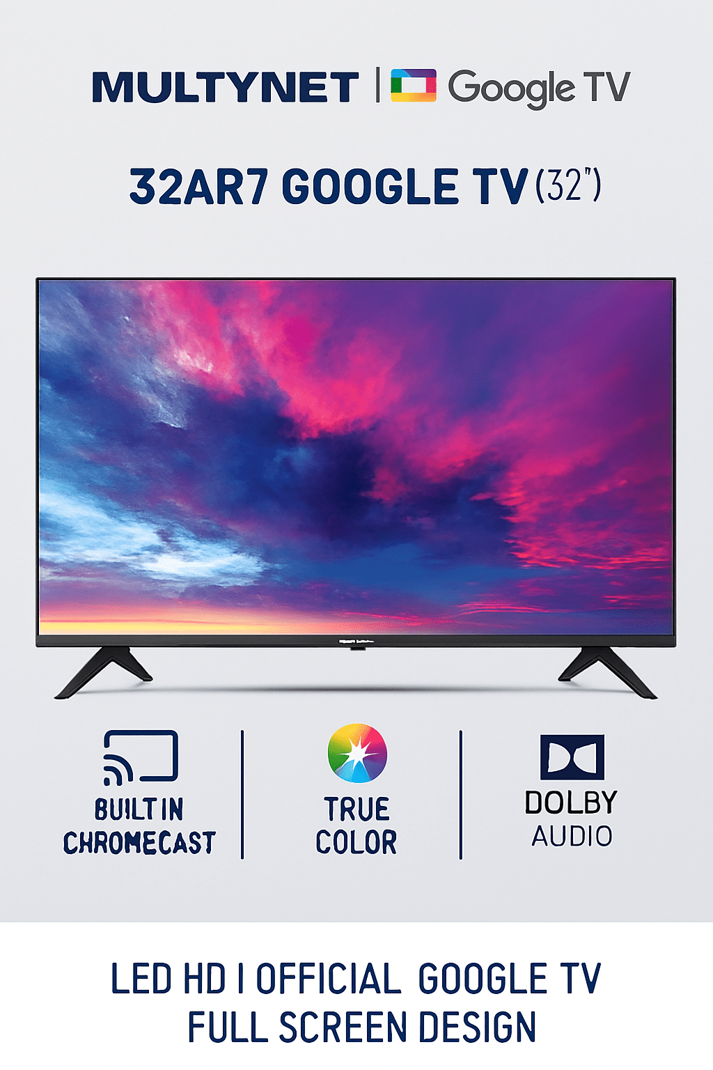 The Multynet 32AR7 LED Google TV 32″inch is a compact smart television designed to deliver entertainment with style and convenience. Featuring a 32‑inch LED panel with HD resolution (1366 × 768), it brings crisp visuals enhanced by True Color technology, ensuring vibrant and lifelike images. Its full‑screen design maximizes immersion, making even a smaller display feel expansive.
