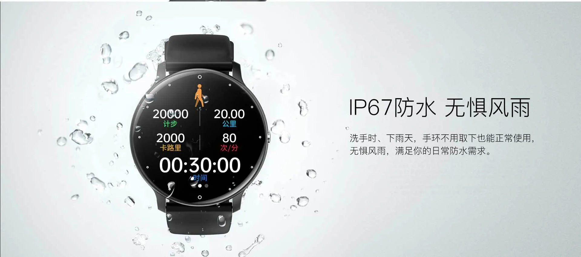 The watch features an IP67 waterproof rating, making it suitable for workouts, hand washing, and light rain. Its strong ABS + PC body with a comfortable silicone strap ensures durability and comfort throughout the day.